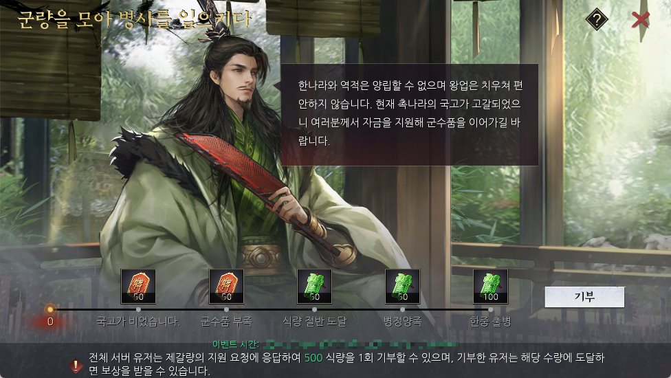 ·이벤트 기간 동안 전체 서버 유저가 제갈량의 호소에 응해 500식량을 기부할 수 있으며, 각 주공님은 1회 기부할 수 있습니다.