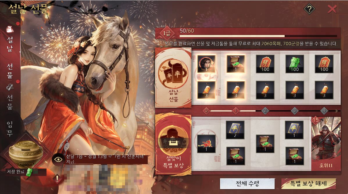 - 이벤트 기간 동안 설맞이 특별 보상을 구매하고 해제하여 영구 말풍선, 등용서신, 백성 특별 보상, 5성 호위 카드 등 초특가 보상을 받을 수 있습니다.