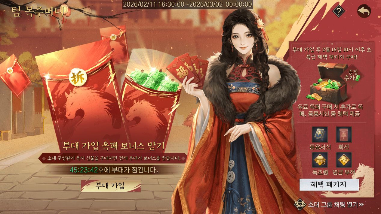 - 소팀에 가입한 주공은 2월 16일 11:00(UTC+9) 이후 인사 선물 및 복지 선물을 구매할 수 있으며, 고급 옥패, 추가 옥패, 등용서신 등 다양한 보상을 받을 수 있습니다.