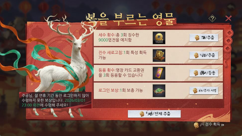 · 주공은 설 기간 동안 로그인하지 못해 수령하지 못한 일부 보상을 설 점수로 되찾을 수 있습니다.