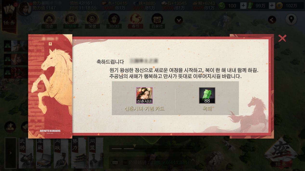 ·설날 연회 초청장은 동맹/단체/세족/가문 채널에 발송 가능하며 다른 구성원들은 참여를 터치한 후 일정량의 옥패를 랜덤으로 획득할 수 있습니다.