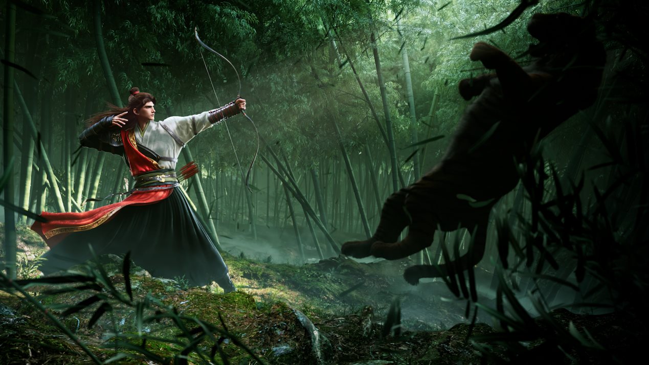 깊은 대숲에 범이 포효하니 풀빛마저 놀라고, 젊은 군주가 활시위를 당기자 옥빛 깃 화살 소리 울리네.