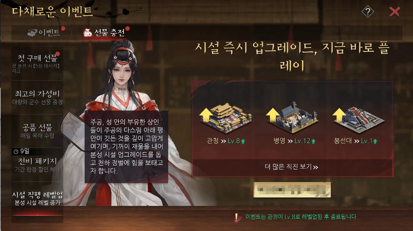 서버 오픈 후 15일이 지나고 관청 레벨이 8레벨 미만일 경우, 주공께서는 21500위안의 시설 즉시 업그레이드 패키지를 구매해 본성 시설 레벨을 한층 더 높일 수 있습니다. 패키지 구매 후 시설 즉시 업그레이드 레벨은 아래와 같습니다.